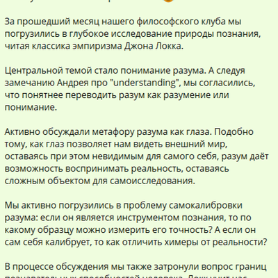 - Вы не одни со своими мыслями наедине: рядом люди, которым тоже важно думать глубже. Это даёт опору, мотивацию и ощущение «я среди своих».