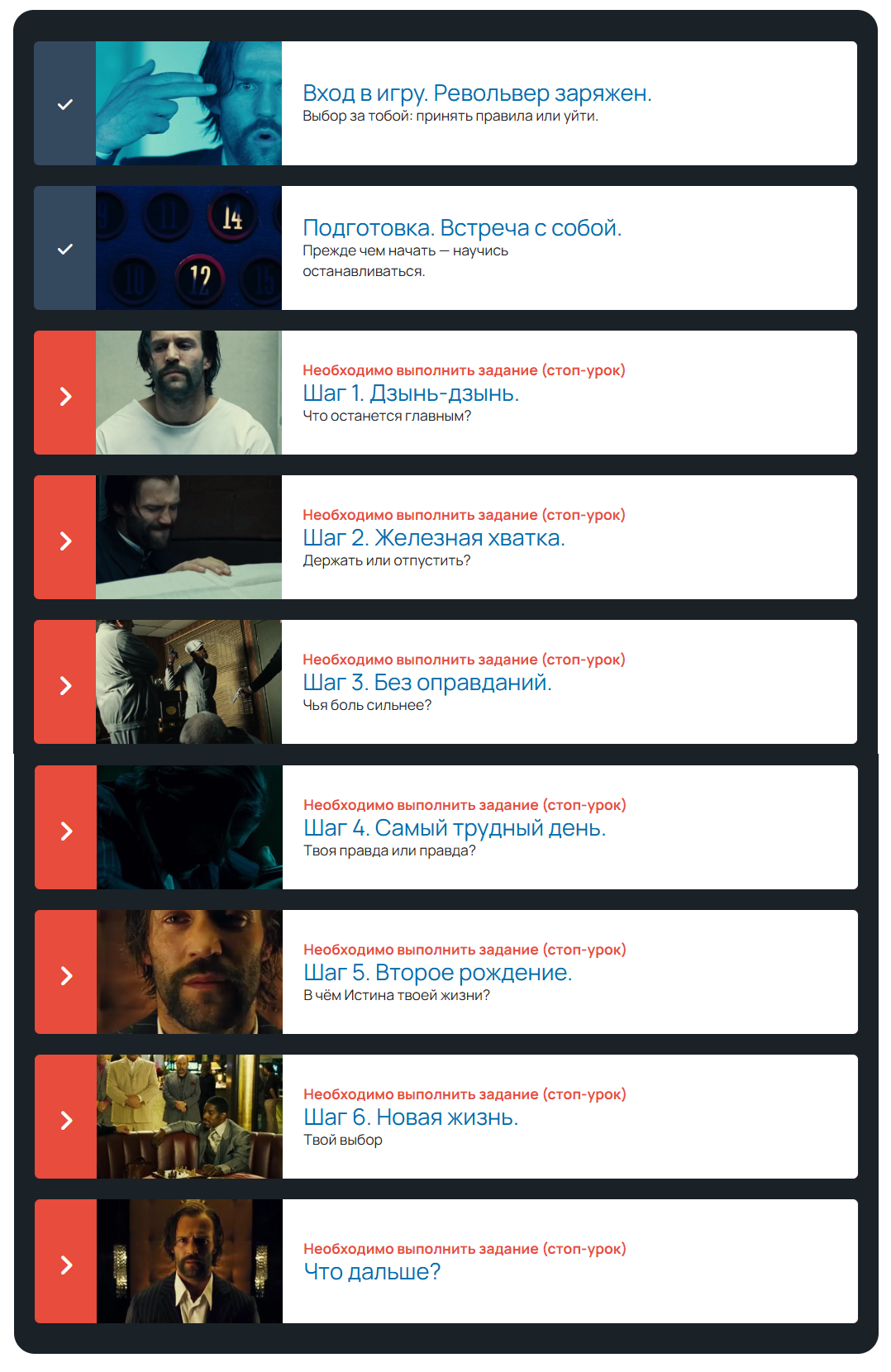 Это не скучный онлайн-курс и не нудная лекция. Это 6 часов кинематографического приключения, где адресат — главный герой в стиле персонажей Гая Ричи. Задания просты по форме, но бьют точно в цель. Подарок, который не «надо проходить», а который «невозможно бросить». Ты даришь не обучение, а 6 часов чистого адреналина и самопознания.